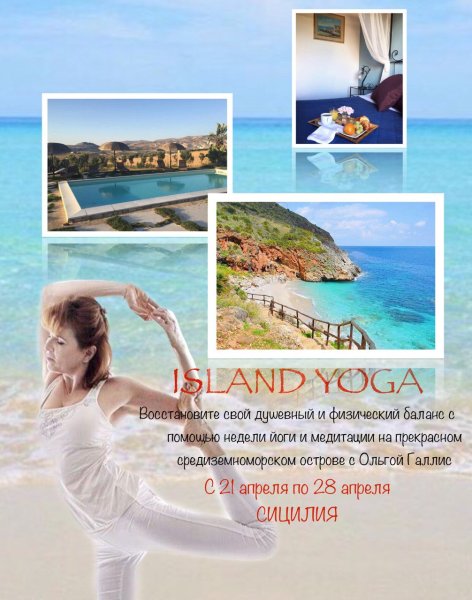 ПРОГРАММА ТУРА: Группа 8 человек 20-27 для Дюсельдорфа (Ryanair) ; 21-28 для Москвы (Победа) (20) 21 апреля - прилёт в аэропорт Палермо, встреча в аэропорту, трансфер на виллу, размещение. Йога-класс. Ланч. Релакс около бассейна на фоне потрясающих видов Сицилии. Ужин 22 апреля -йога класс, завтрак, отдых у бассейна, ланч, трансфер к морю, йога-класс, возращение на виллу, ужин 23 апреля йога-класс, завтрак, трансфер в Эриче, прогулка по средневековому городу, обед, трансфер на виллу, ужин 24 апреля завтрак, трансфер к морю, йога-класс, ланч, возращение на виллу, йога-класс, ужин 25 апреля Йога-класс, завтрак, Палермо, обед, возращение на виллу, ужин 26 апреля Завтрак, трансфер к морю, йога-класс, ланч, возращение на виллу, йога-класс, ужин 27 апреля йога-класс, завтрак, шопинг и свободное время в Трапани или на море ( по желанию), ланч, возращение на виллу, ужин (27) 28 апреля -завтрак, трансфер в аэропорт, вылет О ПРЕПОДАВАТЕЛЕ Меня зовут Ольга Галлис. На протяжении более 20 лет я практикую йогу и являюсь сертифицированым преподавателем йоги. (Power Yoga World Centre). Языки преподавания: Русский / Английский / Немецкий Образование POWER YOGA WORLD Сертификат преподавателя 350 часов Конференция йоги в Кёльне 2014 Work shop "Budokon style" с Cameron Shayne 2014 Work shop "Тайский массаж и Ариал йогаl" с Krishna Takis и Jason Nemer 2014 Мастер класс Master of Power Yoga Brayan Kest 2014 Workshop "Retreat experience"с Nikki Costello 2014 Конференция йоги в Кёльне 2012. Конференция йоги в Кёльне 2010 120 часов с Андреем Лаппа "Universal Yoga" 2005, Мастер класс с Shri Dev-The Maharadji, Rishikesh 2003